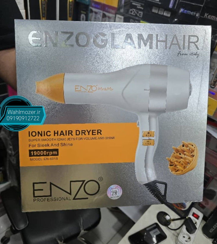 خرید سشوار ENZO مدل EN-6018 با موتور قدرتمند ۱۹۰۰۰rpm و فناوری یونیک برای کاهش وز مو. طراحی ارگونومیک و ظاهر نقرهای-طلایی، مناسب برای سالنهای زیبایی و استفاده شخصی. ارسال سریع از Wahlmozer.ir ✅