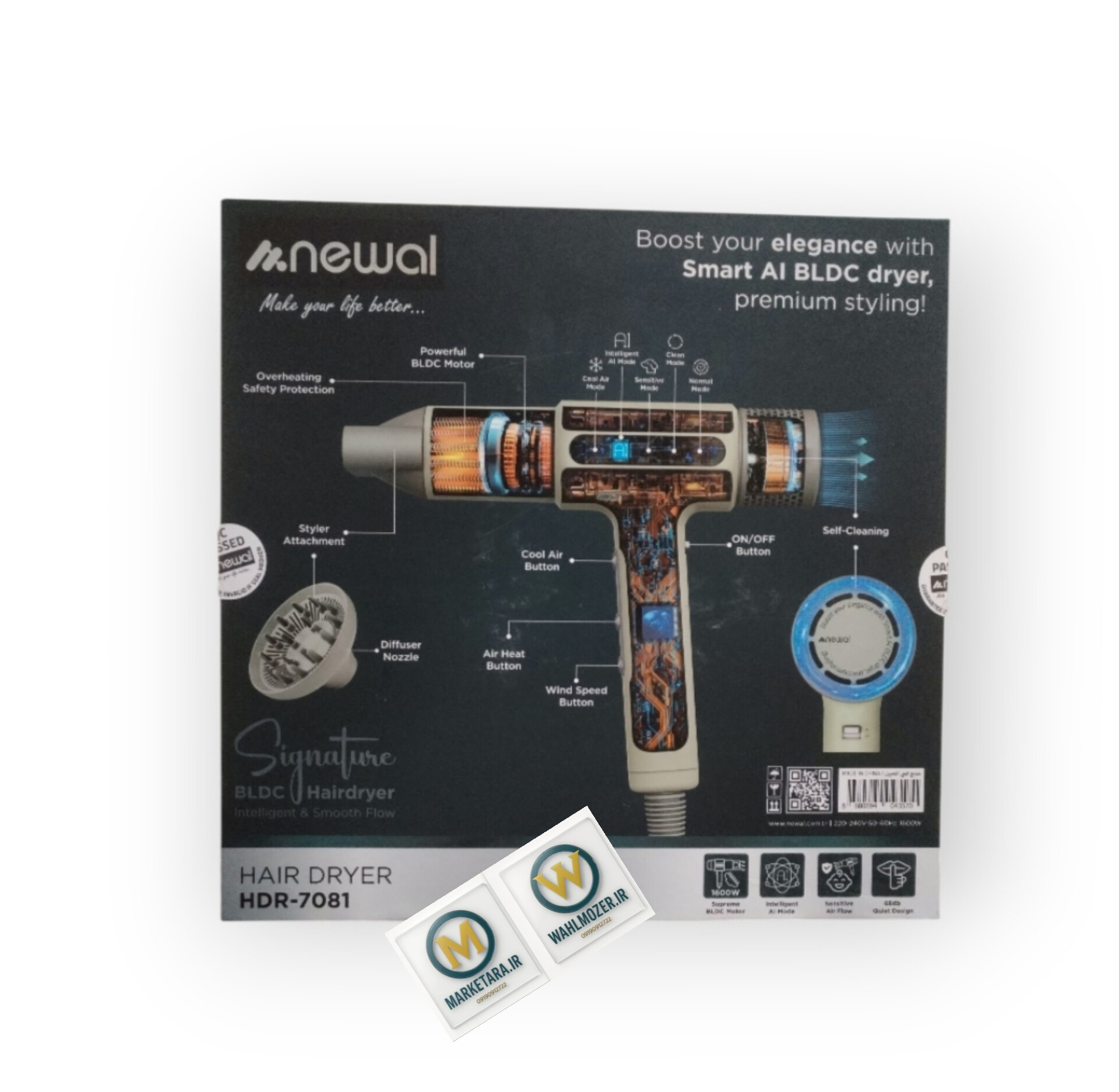 سشوار نیوال مدل HDR-7081 با موتور BLDC هوشمند، کنترل دمای دیجیتال، یون منفی و نازل مغناطیسی، انتخابی عالی برای خشککردن سریع و حالتدهی حرفهای مو است. مناسب برای سالنهای زیبایی و استفاده خانگی. خرید آنلاین از MARKETARA.IR و WAHLMOZER.IR با ضمانت اصالت کالا.